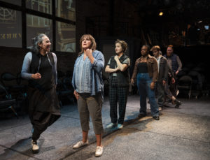 Throughout the show, we see “direction and movement.” Elizabeth Margolius’s direction is more coordination than choreography. Music direction by Andra Velis Simon is wonderful! The first act largely has to do with understanding the crime. Many residents, who are disturbed by this reality, try to cheer each other up by planting a lovely garden or flowerbox in the summer months and by relishing in the joy of the Christmas season. But others become angry and uncertain. Later, we learn a bit more informed about the prostitutes themselves and see their portraits flashed on two walls behind the audience. By now we already know who probably did the killings—and it’s a matter of seeing the cases wind through the court system and covered by the news media.