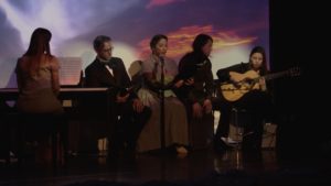 Hosted by the Chicago affiliate of the Instituto de Cervantes, this production by the Water People Theater Company is not without its faults. For starters, watching this show can problematic if one does not know Spanish. To make up for this, there are two monitors on either side of the stage, with English translations of the text and the song lyrics. While the word choice is intriguing (assuming that the translation into English is faithful), I nevertheless found it hard to simultaneously read the titles, keep track of the various characters, and follow the action. Considering I had no previous familiarity with Lorca’s works, I felt that I lacked some foundation for understanding this performance. Since there are no physical programs (and no QR code for reference to an electronic program), an uninitiated theatregoer with little or no knowledge of Spanish literature probably doesn’t have enough background to figure out exactly what is going on. I didn’t know whether the component short stories (i.e., “The Shoemaker’s Prodigious Wife”, “Doña Rosita the Spinster”, “Blood Wedding”, “The House of Bernarda Alba”, “Yerma”, and “Mariana Pineda”) are based on actual or exaggerated situations that once existed. It would have helped to ground the performance using a card at the beginning of each vignette, with the title of each short story, the place and year when it took place, and a sentence or two about its context. The cast includes Carlota Sosa Bernarda Alba), Rebeca Aleman (Yerma, Mariana Pineda, pianist), Ana Santos (The Mother, Neighbor, First Washer-Woman, singer), Kris Tori, (Doña Rosita, The Bride, Second Washer-Woman), and Teresa Echeveste (The Shoemaker’s Wife, Third Washer-Woman, understudy).