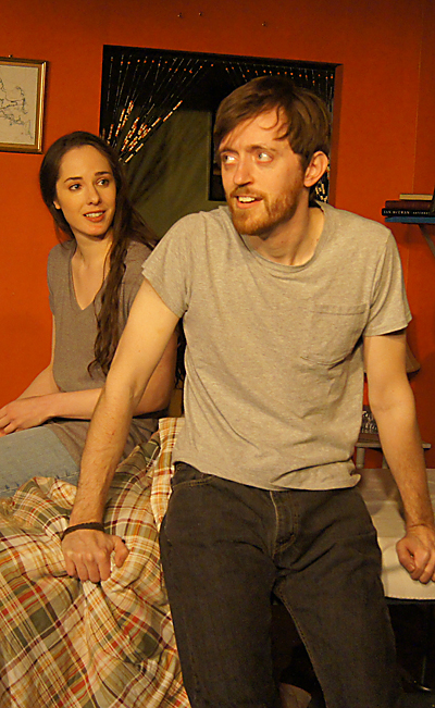 Their current production. “Love and Understanding” is part of what they are calling their “More Red” series, by British Playwright Joe Penhall. While he is British, I truly see no reason for this particular play to be done as a british play with accents. There is only one or two mentions of England, so why not make the play more “American”, since then the actors could just develop their characters using their own speech patterns. Director Jaclynn jutting, has found a way to use this small theater to simulate an apartment ( of course being British, a Flat), a medical office /examining room in a hospital, a Pub, a bedroom, the bank of a river and a hospital room, all with just a small change here and there, thanks to the clever design by Keenan R. Minogue). There are also some great props used and put out by stage manager Megan Gallagher, who often is the forgotten individual who makes the pieces of the play fit together.
