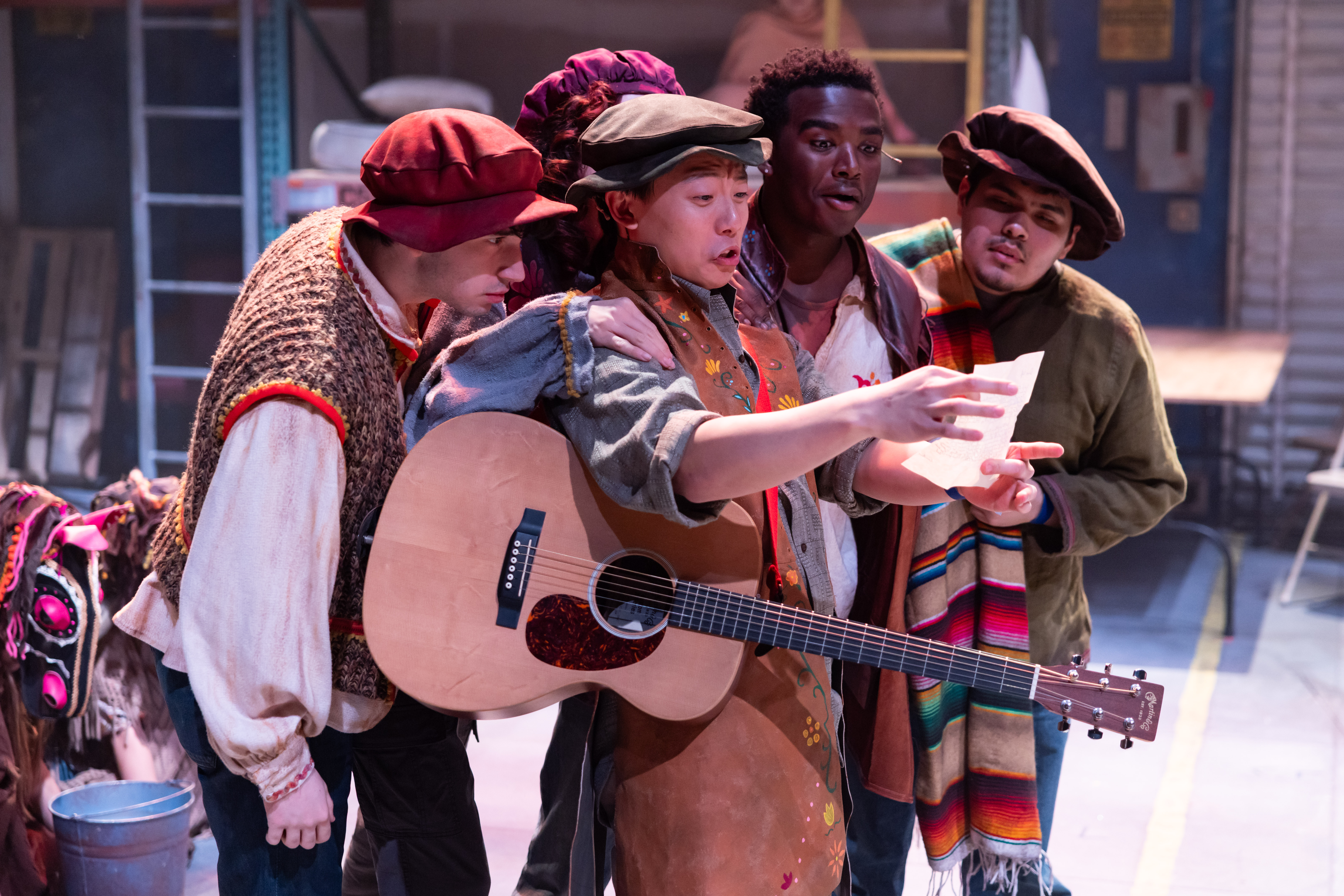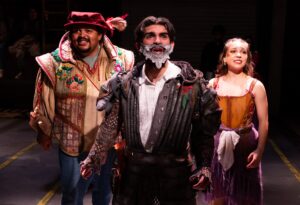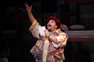 The set (A Inn Doo) is powerful, with bunk beds lining the walls, a garage door ( that will open to a loading dock/with truck filled with Mexicans late in the play), and countless back room items one would find in a vacant store. These become the props as well. Josie Everett’s costumes are top-notch. Everything that comes out of Cervante’s trunk takes us back to a different time and each costume is perfect. While there is not a lot of choreography, Tallulah Nouss has done some clever things with the rape sequence where Aldonza leaves her body as the men have at her. The lighting (Sierra Walker) and sound (Forrest Gregor) are perfect and the  orchestra ( offstage) under the direction of Andra Velis Simon ( who is also the keyborad player and musical director) superb. Welcome back Andra!