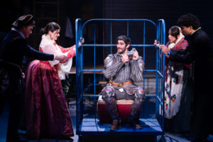 This version takes place in an empty K-Mart ( or similar big box store) near the Texas/Mexico border, and all of our holdees are awaiting deportation to Mexico or their homeland. Of course, our hero has his aide/sidekick Sancho ( played to perfection by Nathan Hiykel) and he selects a young lady, Aldonza (Coco Gonzalez has the perfect vocal range) to be his “Dulcinea”. The music (Mitch Leigh) and lyrics ( Joe Darion) bring that song as well as “To Dream The Impossible Dream”, “I Really Like Him”,  “Little Bird, Little Bird”, “Knight of the Woeful Countenance” and of course “Man of La Mancha”. The musical numbers in this show are designed to move the plot along and while there are a few standout numbers, there are very few major production numbers.