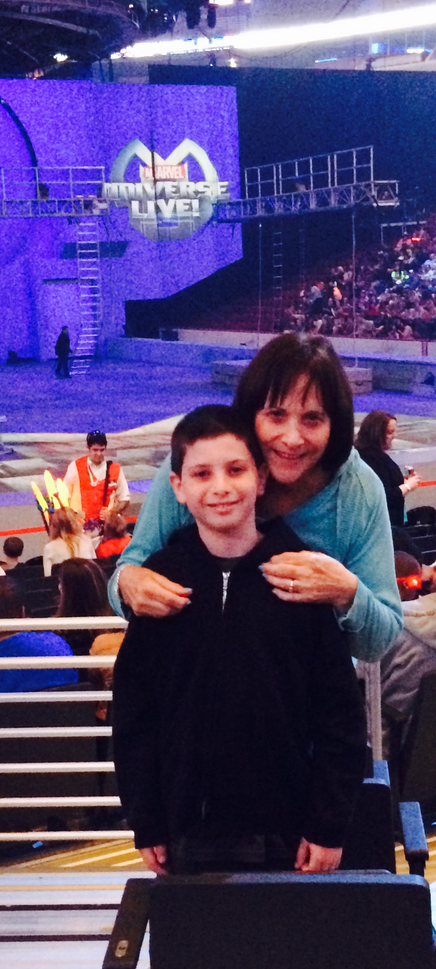 The show is filled with special effects, motorcycle rides, fireworks, characters flying and climbing places they should not be able to get to, but even though we see the wires, the tumbling and gymnastics holds the attention of the audience from start to finish. As for Adam, who is ten and very much attuned to these characters, the stories of the films and of course to attending live theater, he liked the total presentation, but felt that it is more for the age group of six to eight. What was kind of weird was that the entire production which started at 7:30 p.m. and was over at 9:15 had an intermission of 23 minutes at about 35 minutes into the story. I guess selling refreshments and souvenirs is paramount for these productions. The only time they come into the arena to “vend” is before the show begins and at intermission. In fact, once the second act gets into the 15 or 20 minute part, they close the food services. Don’t know why, but needless to say, when the show is over, the souvenir vendors are raring to go.