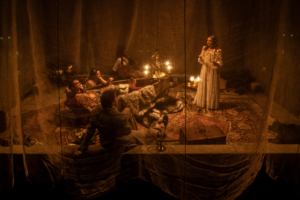 The rest of the cast of five are:Debo Balogun as Dr. John Polldori, Keith D. Gallagher as both Lord Byron and “the monster” and the incredible Cruz Gonzalez-Cadel ( making her Lookingglass debut)as Claire . This cast, while small in numbers truly shows us the power of live theater and how we the audience get caught up in their story.