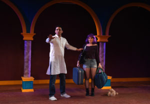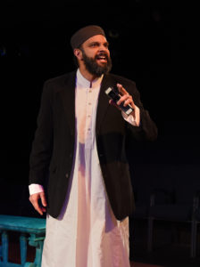 The show has been redone and changed and felt much longer than in its original form ( the running time is  almost  three hours with one intermission). That may have been a part of the problem for me. The story is about money-lending ( just as the original) but in this version he is not Shylock, The Jew, but rather Sharuk, the Muslim( played handsomely by Anish Jethmalani). He has lent a great deal of money to Devender (deftly  handled by Madrid St.Sngelo) a Hindu. With language that is modern-day, “west coast”, Kurup has re-imagined Shakespeare’s plot of the original to a story of modern times between Hindu and Muslim Americans, allowing the use of prejudice to be shown in a different manner.