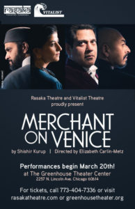 This play is a joint production by Raska Theatre Company, Chicago’s ONLY South Asian theater ensemble and Vitalist Theatre Company. “Merchant on Venice” will continue at The Greenhouse Theater Center , located at 2257 N. Lincoln Avenue – Mainstage UPSTAIRS thru April 15th with performances as follows: