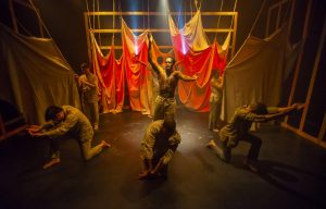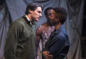 Scenic design by Joy Ahn allows us to imagine the bush of Africa and as the cargo ships and clandestine containers they hold. Simple property design by Rachel Lambert works well in this regard. Costume designer Caitlin McLeod uses effective materials to create garments appropriate to each of the settings. Since many characters turn around and play other characters, often in the very next scene, it is essential for the audience to pay attention to the costumes that demarcate one scene from another.