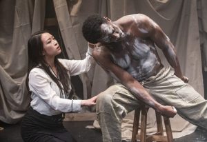 The Midwest premiere features a terrific cast, including Sarah Lo, Collin McShane, Christopher Thomas Pow, Ben Chaung, Michael Turrentine, and Lewon Johns. Johns doubles as the violence and intimacy designer and does an extraordinary job, especially in the way we see Mlima being tortured and killed. This brings up the most troublesome part of the performance: Mlima is slain much too close to the front the stage such that a good portion of the audience cannot see the exact way in which he dies.