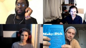 Although Melville’s original text contains many characters, they have been largely distilled into four: Ishmael (Elizabeth McCoy), Captain Ahab (Robinson J. Cyprian), Starbuck (Mack Gordon), and Stubb (Mack Gordon). Throughout the performance, Bradberry serves as stage manager and reads the settings for various scenes. The performers do a marvelous job modulating their voices and doing accents in order to play a number of distinct characters; it is amazing to hear how their timbre mixes perfectly. With COVID, each of them had to turn a closet in their homes into a soundproof booth and double as foley artists, experimenting with sound effects. Original music by Nick Montopoli was forceful and expressive, adding to the intensity of the action and playing up the dramatic elements within the text. With only the script to work with and no visuals, Montopoli found writing the music to be a “superinspiring” challenge. Prerecorded hymns and sea shanties sung by the cast round out the sound.