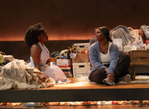 These thought-provoking and potentially explosive ideas are presented under the direction of Amber Montgomery in Shattered Globe Theatre’s Midwest premiere, now playing at Theater Wit in Chicago. After the world is turned on its head with the covid pandemic, we are looking through a one-day peephole at an overwhelmed mother (Kristin E. Ellis as Mia) and teenage daughter (Emefa Dzodzomenyo as Dailyn) coming out of lockdown as they begin the slow return to in-person interactions.