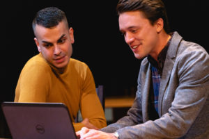 [rating=3]Another World Premiere has hit a Chicago stage. This time at The Den Theatre as part of the season for About Face Theatre Company. For those of you familiar with About Face, part of who they are is a theater company that advances LGBTQ through stories that are educational and bring life as it is to the forefront. Their stories are “queer stories told by queer artists” sharing them as well as celebrating their stories. The premiere of “Mosque4Mosque” written by Omar Abbas Salem takes us into an even less understood world, that of the Muslim queer.