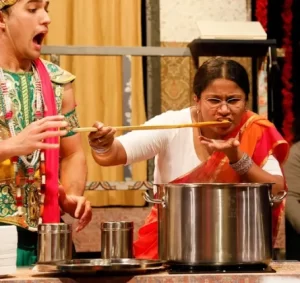 Although the story is scripted, the fourth wall doesn’t exist, and there’s a fair bit of improv – and a lot of laughter – as both Mrs. K. and James interact with the audience. You might be called upon to pass out Indian scarves or to carry stuff for Mrs. K. You might be scattering flower petals or stirring her simmering pot of dahl. Don’t worry, it’s all fun and hilarious!  After the show, you’’ll even get to sample the dahl.