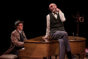 The name of the play is “Murder for Two” with a book by Joe Kinosian, who also wrote the music and Kellen Blair , who also write the lyrics . These two genius minds have created an amazing romp of a murder mystery with two actors playing all the parts. Let me clarify this. Noel Carey plays Marcus, the would-be detective who is just waiting for his opportunity to show his Chief that he is the best man for the department. All of the other characters in the play, the victims and those who are “suspects” are handled by Jason Grimm ( an extraordinary physical comedic talent). These men are both onstage from prior to the play even starting to its ending, and both of them play the piano as well as sing and provide the comic touches that will have you laughing for the entire 90 minutes of “mayhem”.