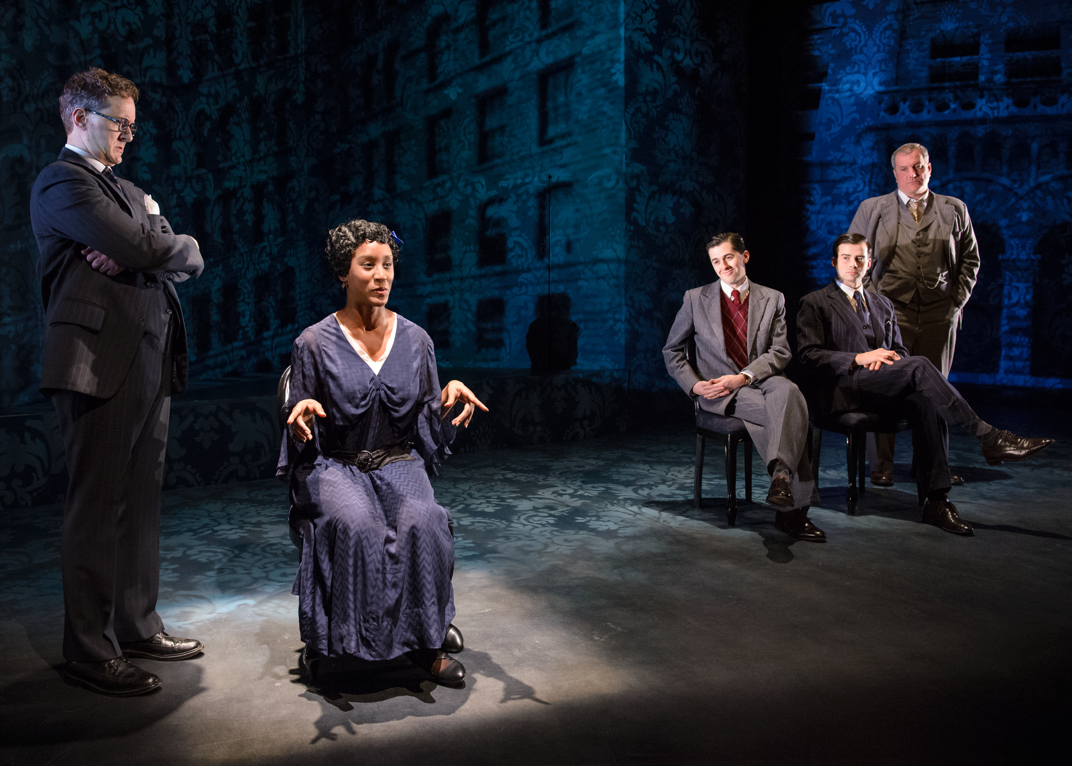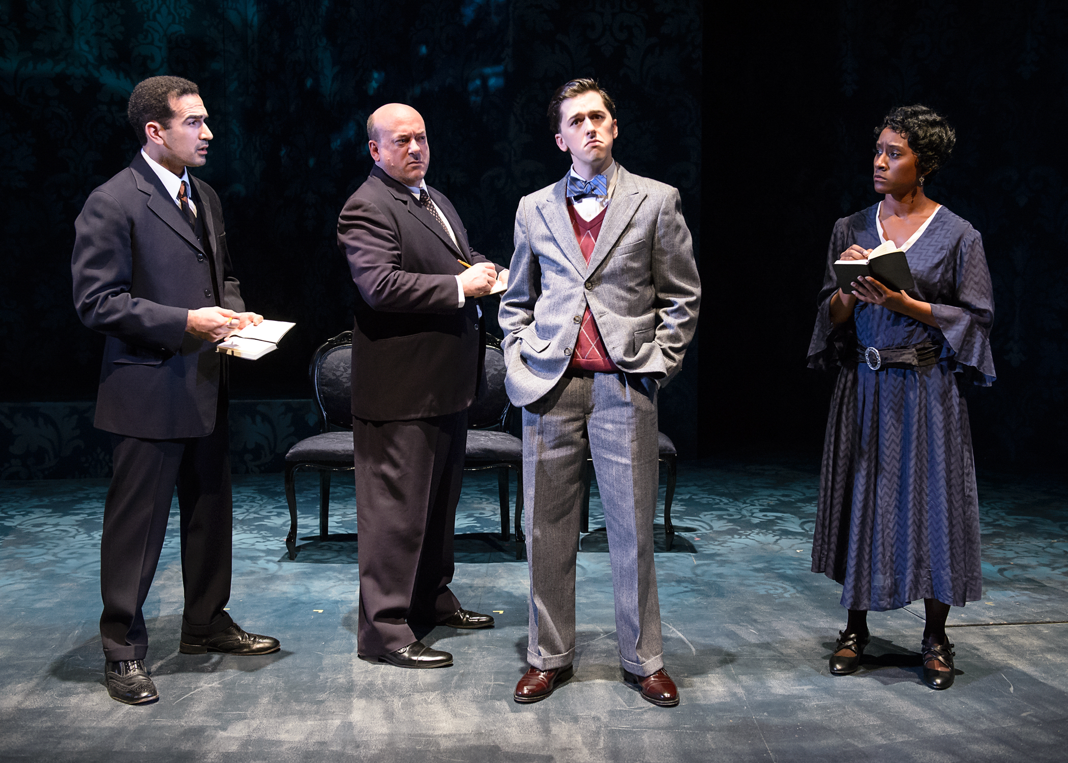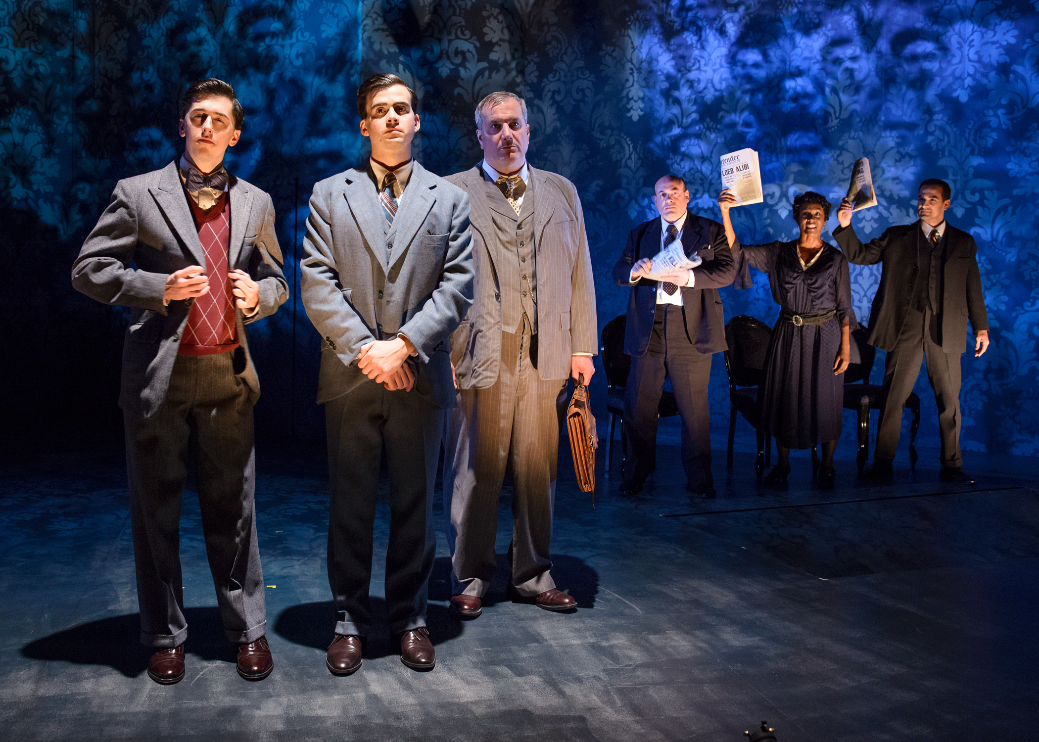 This dynamic 95 minutes of story telling takes us deep into the mentality of these men and what the newspapers were seeing and writing. We also meet the lawyers involved in the case’ the District Attorney Crowe ( a powerful performance by Derek Hasenstab) and for the young men, Clarence Darrow (deftly handled by Chicago favorite Keith Kupferer). They present their cases to the Judge (which is represented by the audience) and as you will see, there are many surprises in the story line. Amazing for the time period in which the story takes place in. This is a solid cast through and through with the other cast members, handling several roles. They are Demetrios Troy (reporter 3), Celeste M. Cooper handling all the female roles and Bill Bannon as reporter 1.