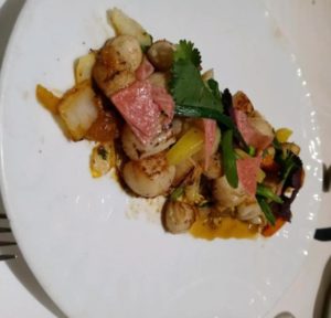 The entrees we sampled from their amazing menu were the Organic Pacifico Striped Bass (cremis ,eggplant, bacon and porto) with flavor that truly is wonderful., The Prime Nebraska Filet Mignon with roasted potatoes, watercress and cremis was juicy, tender and prepared to exactly “medium”. The third dinner was the Wild Mexican Bay Scallops (in a sake-soy broth, cilantro and ” White Boy” Kimchi). The funky Kimchi is Mark’s recipe that can be ordered thru the restaurant ( it has a slight kick, but one that will please to the palate). We also had some amazing Whipped Potatoes Parmesian.
