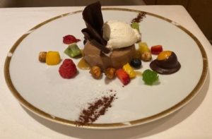 As we prepared for Dessert ( what a selection)Mark and his crew brought us an after dinner wine from Robertson Wines- from South Africa. I believe it was called Gewurtztraminer and it cleansed the palate as we prepared for our coffee and-The AND was very special indeed: The Callebaut Chocolate-Caramel Pot de Creme was a delightful combination of hazelnuts, butterscotch and seasonal fruits. As you can see by the tray being held by Bela, the selection is something