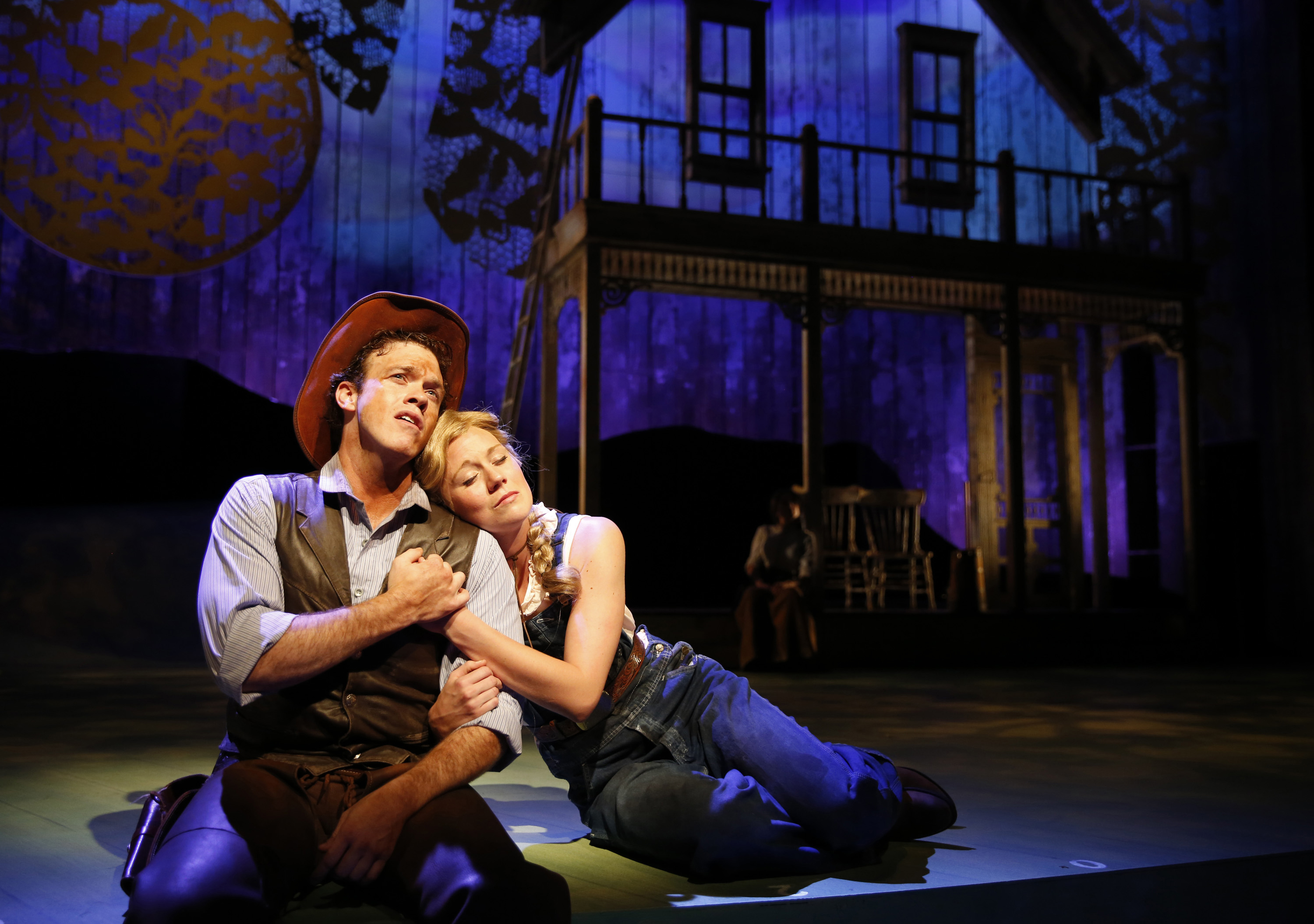 Corti has put together his production using all of the original musical pieces, as well as original dances created by Agnes DeMille and choreographed by Katie Spellman. The “Out Of My Dreams” ballet is spectacular! Scott Davis has designed a set that allows for our imagination to  see things simply, so that we can focus on the importance of the words being said and sung. The voices that have been found to play each of the role sin this story are amazing, starting with the opening number “Oh, What a Beautiful Mornin’ “, sung by our hero, Curly (brilliantly played by Colte Julian, who amazingly is from Oklahoma), as he comes down the aisle from the audience to the stage. Attracted our attention pretty quick!PT_OK_10