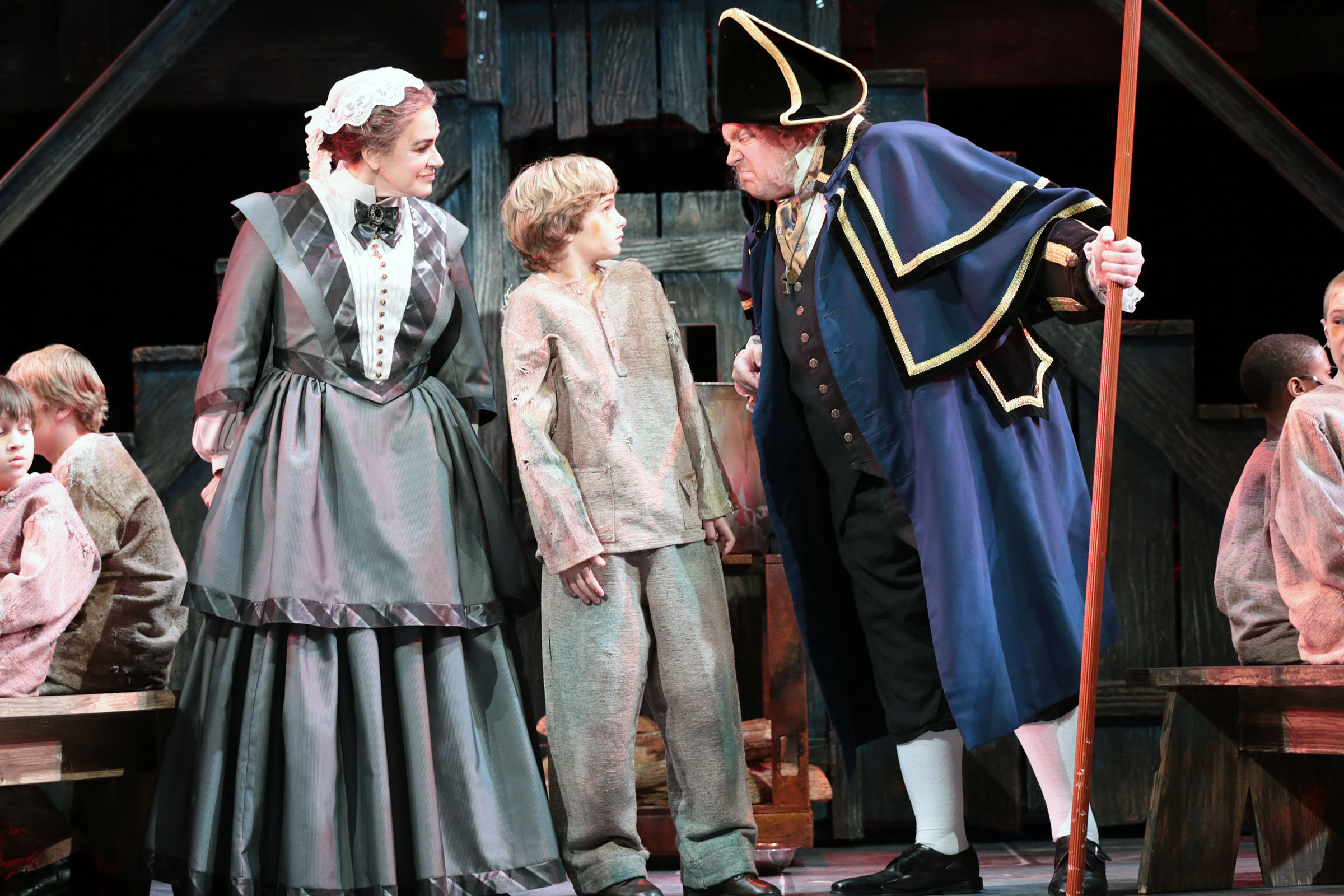 In addition to Mr. Reeger, who plays the Jewish thief ( Dickens was anti-semitic to be sure), we have as Oliver, Brady Tutton, an 11 year old from Shorewood Wisconsin, who as it turns out has worked with Ms Rockwell before ( so she was aware of how much talent he has, allowing for some of the high notes to be used, where often they are not), The incredible Heidi Kettenring as Nancy and another incredible young talent J.D. Rodriguez as Artful Dodger, fagin’s right hand man (boy). His handling of “Consider Yourself” was spectacular!; John Gawlick handles the role of the evil Bill Sikes ( and I am very glad they cut his song out and did not have a dog tailing with him- kids and animals are just more than we need and these kids do not deserve to be upstaged).’ Michale Aaron Lindner and Catherine Smitko as Mr. Bumble and Widow Corney, the orphanage trustees are both terrific (and having seen many productions of this show, I must say that the way they played off each other was by far the best I have ever seen) Other major characters are Larry Adams as Mr. Brownlow ( Oliver’s Grandfather), Don Forston in several roles,Catherine Lord,Glory Kessel,Benjamin Magnuson and Rebecca Pink.
