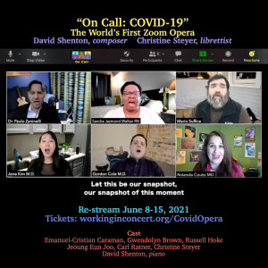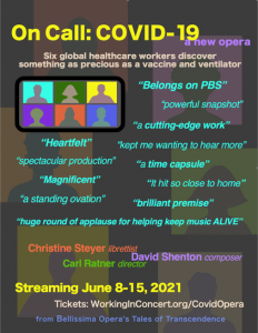 Working in Concert has brought “On Call: COVID-19 Opera” to its virtual audience via its website: https://workinginconcert.org/covidopera/. This is a limited return engagement, available as video-on-demand, through June 15, 2021.