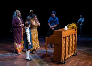 The production relies on the cast to make it work. There is no actual set, although Joonhee Park has created the mood thru what we see. Yael Lubetzky’s lighting works and sets moods as needed. Sarah Ramos and Christopher M. LaPorte have made sure that we hear every word either said or sung by this glorious cast. Each word is of great importance .Rachel Wilson handles the props, which in this particular production are in reality the set ,and the costumes by Gregory Graham add a nice touch.