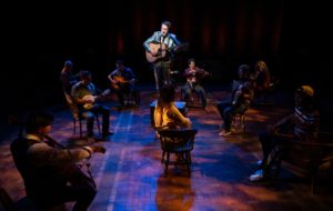 [rating=5] There are “musicals” and then again, chamber musicals. Writers Theatre is a perfect venue for “chamber” pieces. It is an intimate space where the audience, no matter where they are seated, has full access to the stage and the performers. Many of us were lucky enough to see the touring production of “Once” as part of the Broadway In Chicago series. Based on the 2007 film written and directed by John Carney, “Once” features the music and lyrics of Glen Hansard and Marketa Irglova with a book by Edna Walsh. It is truly a love story and perfect for this intimate space. Many of us agreed that what we saw on Writer’s stage is far superior to what we saw in Chicago. No fancy set! No bar with lots of bottles! Just a simple story told by a cast that has been keenly directed by Katie Spellman, who also handled the choreography and with music direction by Matt Deitchman.