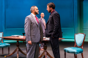The story is one of pure dynamics. A story that one might want to call “the rest of the story” and to pull this off, Bowling has assembled a cast that is powerful . A cast that makes you want to be that “fly on the wall” listening in on what might have been the actual words spoken. The characters we see on the stage are in fact real people, many of whom we read about in the papers and saw on the news during these troubled times in the Middle East. In addition to Sudia and Parkinson, we have Bernard Balbot, Jed Feder ( a marvelous Uri Savir ), Anish Jethmalani ( a powerful Ahmed Qurie), Ron E. Rains (  who brings two important characters to the stage- Yair Hirschfeld and Shimon Peres), Stef Tovar ( a strong Yossi Beilin, who may be the power behind the event taking place), Amro Salama as Hassan Asfour, Bassam Abdelfattah, Julkiet Hart, Tom Hickey ( as Joel Singer, an attorney that did the final paperwork), Victor Holstein and David Parkes.
