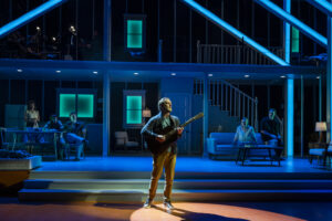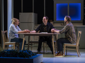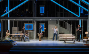 What seems a bit strange is that this house has on the second floor , a small band , and one of its members, Martin ( as always, a wonderful character created by Alex Goodrich) who also serves many other functions, as he is not just a musician as we find out as the story unfolds. The family is composed of a father, Brian (brilliantly done by Cliff Chamberlain), a mother, Dawn ( played to perfection by Becca Ayers) and their daughter, Cleo ( deftly handled by Ellie Duffey). They seem happy as can be and very typical as they open the show telling us, the audience, about their house.