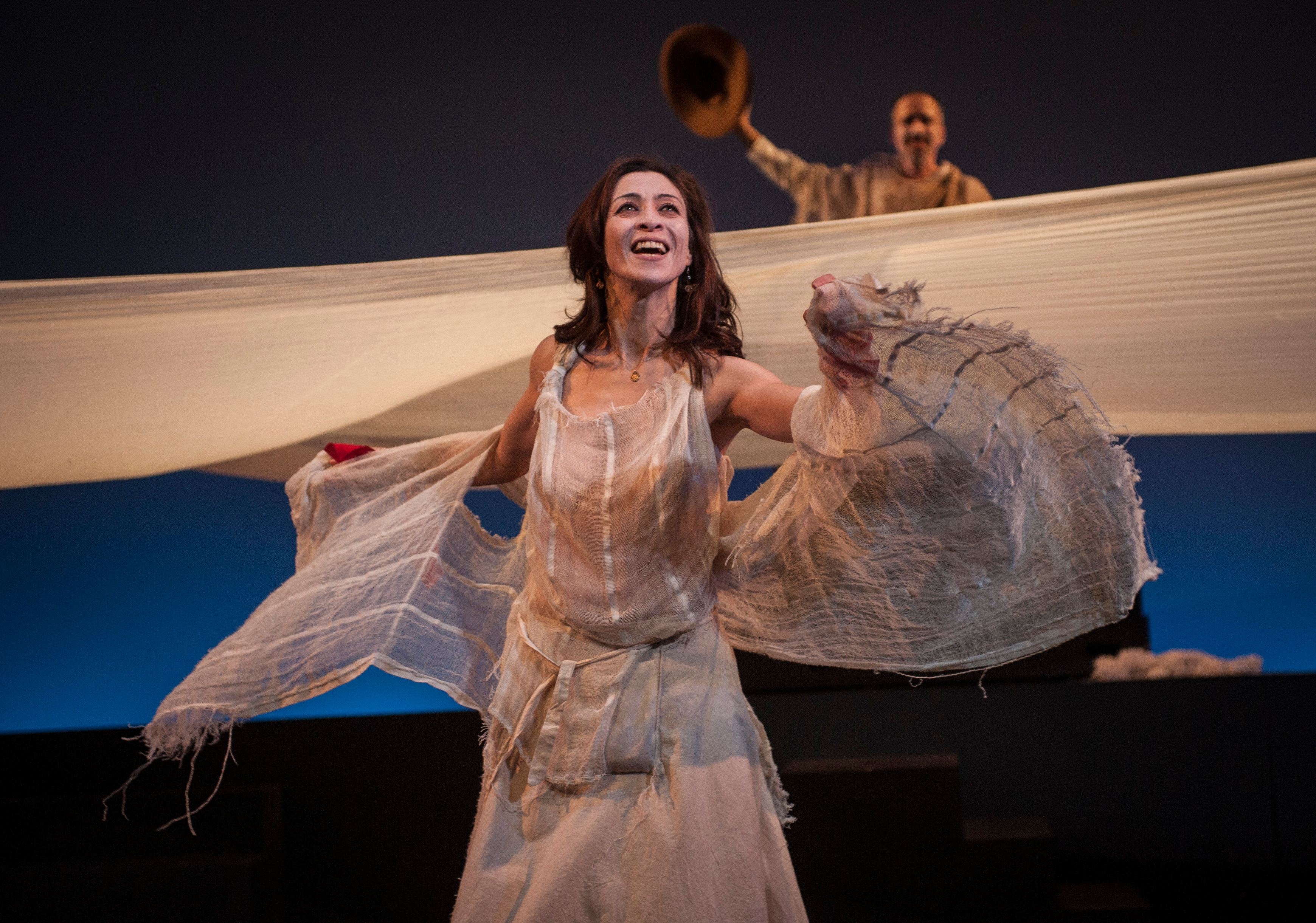 Directed by Godinez and Flora Lauten on a very simple stage in the Owen Theater ( the smaller, more flexible venue), this sparkling production, performed in Spanish , with English subtitles above) tells an amazing version of Juan Rulfo’s novel as adapted by Raquel Carrio. Under normal circumstances, watching sub-titles on a screen can be a detraction, but I found myself not needing to look at the English words as the story telling by this glorious cast led me to follow the story with very little difficulty. The music ( composed by Zacabe Picardo) was both haunting and mesmerizing and the action on the stage kept the audience at full focus on the amazing story.