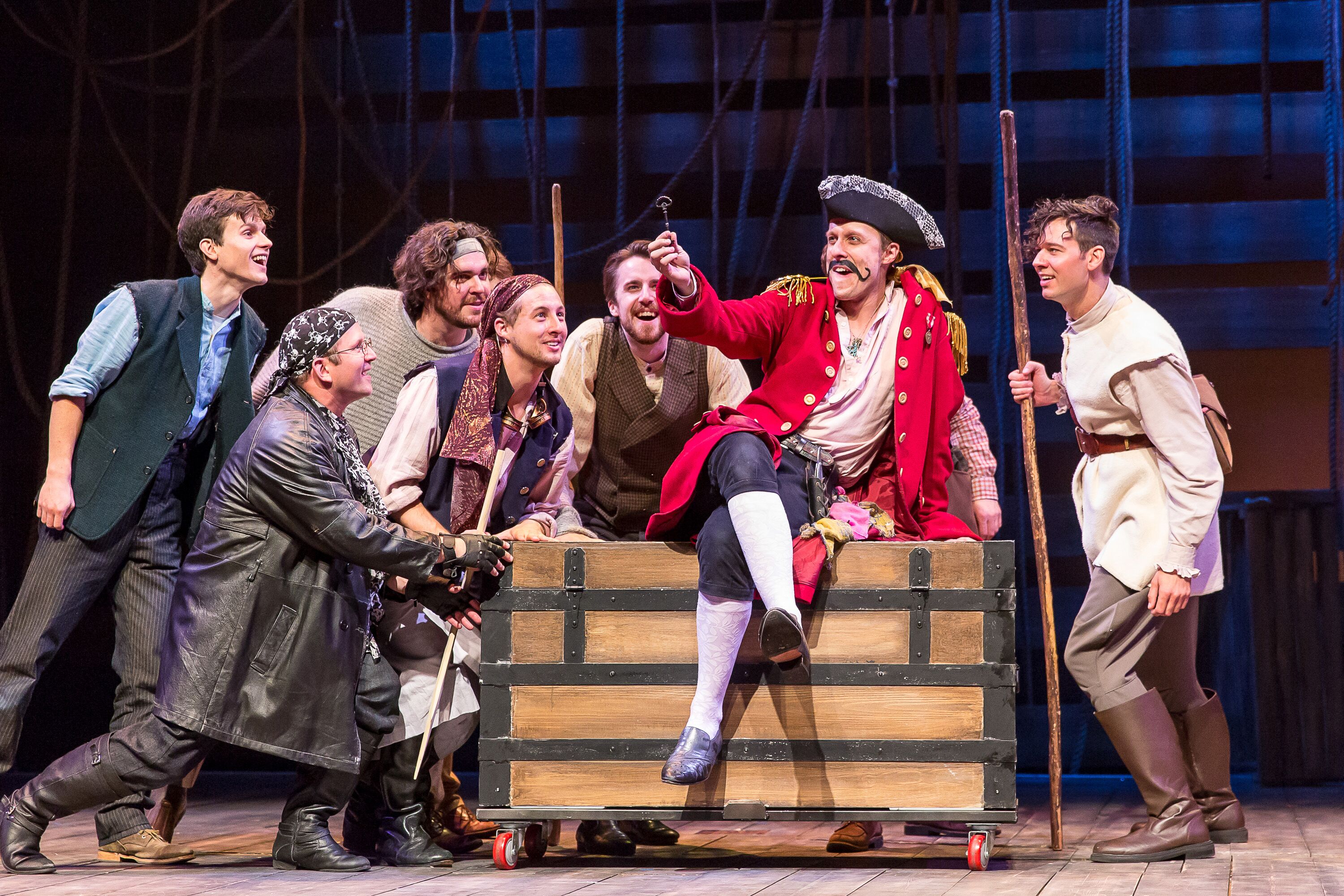 Sitting in tonight’s audience were two very proud parents that are known when it comes to area theaters (and now Broadway as well), the Mueller’s. Their two sons are in this production, appearing together for the first time on a major stage, Andrew playing 4 or 5 roles to perfection and Matt as the villainous Black Stache (better known as Captain Hook for those who know the story). He is wonderful and his Act Two scene where he becomes all hands, so to speak, deserves the ovations that the opening night audience gave him. Watching him develop his character is worth the price of the ticket alone. No wonder the Mueller’s were all smiles! But there is so much more. As I said this is a divine cast. Comedy expert Jeff Dumas is the perfect Smee and Rod Thomas once again shows just how versatile he is with his portrayal of Lord Aster. The other cast members are as follows: Brandon Springman, Jake Klinkhammer and John Keating. They fill the stage with what appears to be a hundred actors!