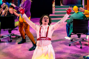 *****Music Theater Works’ production of the Tony Award-winning musical “Pippin” is one like no other! The first thing that the audience observes as we walk into the theatre is the eclectic-looking stage filled with objects from pop culture. We see a series of balconies backed by solid scarves of vivid colors with a chandelier in one box, a box filled with toys in another, and still another containing a large bejeweled Cross. Most noticeable, however, are the multitude of flickering TV and computer monitors, set to different programs. Featuring film clips and animation, largely spanning the years between 1980 and 1992, the constantly changing screens add to the psychedelic unreality of the setting, thanks to scenic designer Shane Cinal. Meant to be anachronistic, comical, and highly entertaining, the performance takes us through the life course of Pippin (Connor Ripperger), a fictional man who is being guided in his decision-making by The Leading Player (Sonia Goldberg), dressed in red and black. As she offers him suggestions on how to find fulfillment in life, the audience can guess that this beguiling temptress is actually Satan, who is interested in obtaining souls after death. With his strong voice and just the right touch, Ripperger plays Pippin to perfection and neatly carries the entire show.