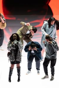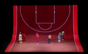 Four Portraits, composed by Caroline Shaw with Jocelyn Clarke as a co-librettist, follows a couple whose relationship is in such dire straits even they are uncertain if one or both of them are already dead. A (John Holiday), and B (Lucia Lucas), still communicate through fragmentary video messages and texts the first time they appear, although mostly to say they’re going to have to do some serious talking…later. B receives a few of these messages while on the train, surrounded by people who are equally closed off and are as shadowy as the surrounding tunnel. Later, while driving her car, she realizes that the helpful, calm, and agreeable voice of her map app is about the friendliest contact she has. An interesting feature of these vignettes is that Holiday is a countertenor and Lucas is a baritone, often creating confusion about which of them is the one singing. Shaw’s music starts off as atonal and minimalist, but subtly blends into harmony, with many striking juxtapositions, including underscoring the countertenor with timpani. Neon lighting gradually gives way to the forests that are ironically absent from the city streets named in their honor, but the forest is clearly no better a place for humans to feel at the center of their world than the urban jungle.