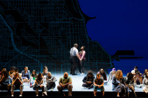 [rating=3] The audience at the Lyric Opera was audibly wowed by the vision and technical mastery on display at the opening of Proximity. A reaction, no doubt, to the projections designed by Jason H. Thompson and Kaitlyn Pietras that dazzled throughout the medley of three original operas directed and curated by Yuval Sharon, but perhaps also indicative that the company had succeeded in its goal of drawing in new people. Conductor Kazem Abdullah, who guided the orchestra through three very different composers’ styles that night, was far from the only talent making his Lyric debut at one of the boldest experiments seen at that house in recent memory. One play about cyclical violence in Chicago’s underserved neighborhoods, one much more abstract about loneliness and alienation, and one pure symbolist about the menace of extinction weaved into each other on a set made of light.