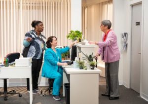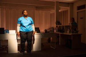 Jaclyn suspects something is amiss when she returns to work after a five-day absence. It isn’t exactly clear whether she was out sick with a virus or an allergy or something else. But when the show opens, we learn that Jaclyn’s doctor has told her that she is allergic to a toxic environment. Therefore, Jaclyn surrounds herself with live green plants to clean out the air, and she also runs a fan on her desk. It turns out, however, that this is all a metaphor for the fact that the toxicity n the air is something that plants cannot remove; rather, it is the poison implicit in the personal relationships among the people working in the office. When patient meetings start taking place first thing in the morning without her, Jaclyn becomes clued in that her job may be on the line. But of course, nobody ever says what she might have done wrong. Hence, it becomes her guess (and the audience’s) as to whether the issue has something to do with her job performance—or something else, like racial prejudice, considering that she’s black and the rest of the office is white.