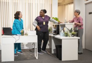 The stage is nicely turned into an office setting due to the efforts of scenic designer Scott Penner. Costume design by Rea Brown is perfectly appropriate for the setting. Jackie Fox’s lighting design is especially creative when you finally see Rasheeda! Christopher Kriz’s original music and sound design work well in this space, although I was concerned that people in the back row might not have been able to hear as well as they could. Persephone Lawrence’s props design is perfect for the setting. I especially liked the use of the three-hole punch, which is not as relevant today as in the recent past, since so much office work is being done on computers.