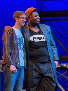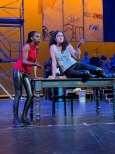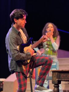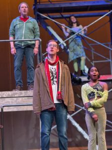 Now, in their new home theater in Wilmette, the McGrath Family Performing Arts Center, with a huge stage and comfortable seating, they are able to put on larger productions. For “Rent”, they have built a set (Lindsay Mummert) that is sectioned off allowing us to see the apartment where most of the action takes place, that of Roger and Mark , as well as the fire escape and the outside locations. With great ease they are able to transform locations just by actors moving tables and chairs allowing smooth transitions. For those who are not aware of the show and story it runs pretty close to three hours ( but the time moves quickly as the audience is engrossed in the story).