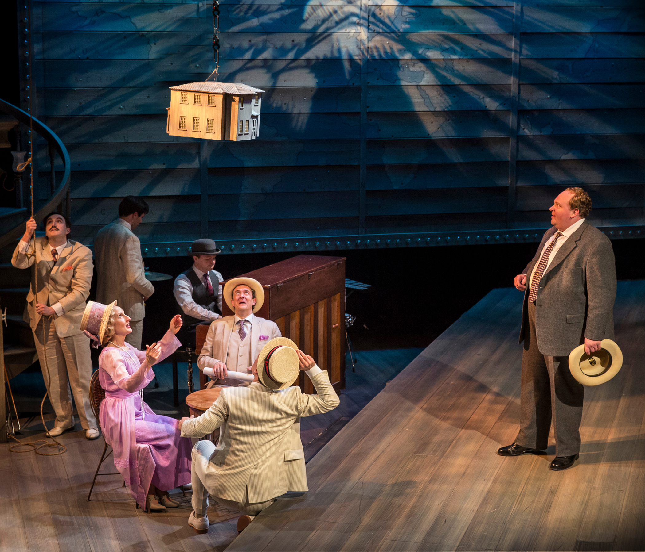 “Road Show”, to many is a new musical, but the truth be known, this may be one of Sondheim’s only failures, as the full scale production that was known as “Bounce” that had it’s pre-Broadway debut at The Goodman Theatre over 11 years ago. While the basic story ( book by John Weidman) it is now a more trim , mor intimate, “chamber musical” and as staged in the Upstairs ( studio-like) theater at CST, under Griffin’s tender loving Care, a far superior way of telling the story about the Mizner Brother ( a true tale ) as we watch them reach for the stars with their get rich quick and flim-flam lives. While it is Wilson, the younger of the two played deftly by Andrew Rothenberg who appears to be in control of their destiny and paths, it is Addison ( Michael Aaron Lindner, who appears to have been born to play this role) who we, the audience care about. He is in fact an artists with a soft heart searching for love and happiness, while his brother is only seeking fortune, no matter who he must crush to get to his goal.![]()