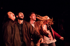 Stoppard’s works can be a challenge for any theatre company but “Rock ‘n’ Roll” is one of his more accessible pieces, dealing more with human emotions and inter-connections than the more cold, cerebral word play and idea deconstruction found in his other plays. It tells the story of a multi-generational “family” and spans nearly 25 years, from the Prague Spring of 1968 to the Velvet Revolution of 1989. Max (H.B. Ward) is an instructor at Cambridge, married to Eleanor (Kristin Collins) who is suffering from breast cancer. They have a young daughter named Esme (Kayla Adams) who worships her father. Foreign exchange student Jan (Julian Hester) has escaped his native Czechoslovakia to study at Cambridge, and Max, who is a Marxist, soon becomes his mentor and includes him in his inner circle of academicians and intellectuals. The action shuttles back and forth between Cambridge and Prague. Many scenes are rapidly played out in Act One and the script sprawls over fifteen years. A clever visual device, in keeping with the title of the show, is utilized so that you will always know what year it is. Act Two consists of one very long scene, a 1990 dinner party in Cambridge around the table of the mature Esme (now played by Kristin Collins) and her daughter Alice (now played by Kayla Adams). Things begin to resemble a Doris Lessing novel more than a Stoppard play here, and the entire script is a sort of love letter to Vaclav Havel, Stoppard’s compatriot and fellow playwright who was elected President of the Czech Republic in 1993.