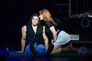 Somewhat Recommended ** There are shows that are geared for a particular age group, and I do believe that “Rock of Ages” is one of these shows. The show, “Rock of Ages” is on its tenth anniversary tour, and is in Chicago for just one week. With a book by Chris D’Arienzo and filled with music by Poison, Styx, Twisted Sister and Whitesnake and others of this period, “Rock of Ages” is a story involving love Yes, as in many musicals, a small town girl. Sherrie ( adorably played by Katie LaMark, who has a powerful voice) heads out to Hollywood to find stardom. Of course she meets a boy, Drew ( deftly handled by Anthony Nuccio) who is also hoping t hit it big, and they  become “friends”.
