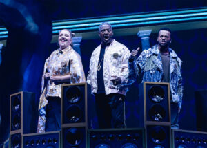 Open captioning is essential for this performance, considering that the songs feature unusual rhyming schemes and unexpected words and wording. Whether if you’re comfortable with listening to rap or not, you’ll still need to read the captions just off stage left or you’ll miss a good part of the underlying meaning of the show. At first, it wasn’t so simple to follow the written words while watching the actors, their body language, their expressions, and their interactions with one another. But as time went on and we became more familiar with the characters, it got easier to follow the action and read the captions at the same time. Yet depending on one’s sightline, some people in the audience needed to work just a little too hard. An additional screen would have helped.