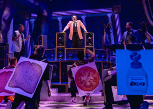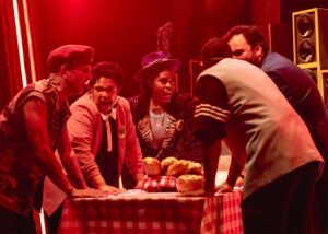With ebullient singing voices and wonderful choreography by Tanji Harper, not to mention clever stagecraft by the entire cast and crew, the play is never dull. Its musical inspiration comes from lots of performing artists, for example, Public Enemy’s “Welcome to the Terrordome”, Ludacris’s “Cry Babies (Oh No)”, and LL Cool J’s “To Do Break of Dawn”, with the songs embedded nicely within the story’s dialogue. While sometimes a bit too obvious and corny, there are tons of thinly-veiled references to contemporary cable news programs, modern Italian restaurants, and, most of all, deli sandwiches and a wide array of breads and buns in addition to the intrigue of the Roman court. One of the funniest segments has to do with the bit about the various components of sandwiches—with the lettuce being somewhat too healthy to make the grade in an era of fast food.