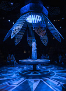 The venue itself was the final member of the ensemble. It is intimate and allows for us to be “the fly on the wall” without the wall. We are in the set, observing and so close ( I was in the first row) you can reach out and touch them. Being an “arena” stage does not allow for much scenery, but in the opening scene, when they are seated to view Konstantin’s play, the stage rises and the ceiling fan comes down to form a cage containing Nina. Otherwise, the scenery if primarily furniture and props (Todd Rosenthal). The sound and original music (Pornchanok Kanchanabanca) and lighting (Marcus Doshi) as well as costumes ( Ana Kuzmanic) were sheer perfection,