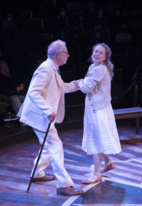 This production is also directed by Peyankov who of course knows the play inside and out ( remember it is his adaptation). The story is filled with love triangles, artistic differences, as different generations gather at the home of Peter Nikolaevich ( Jeff Perry, a co-founder of Steppenwolf who will play this role until May 22nd and then return June 7th-12th with Scott Jaeck filling in for the missing week). Young Konstantin, his nephew ( played with just the right touch by Namir Smallwood) who wants to be a playwright/director is about to show his production. It stars a young neighbor Nina ( Caroline Neff ) who he adores as she does him. Or so it seems. In fact, she is so caught up in her love and desire to be an actress that all else in her life is on the side, including her family.