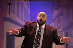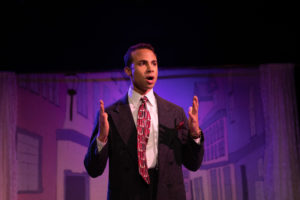 This production, directed by Danny Kapinos takes us on an interesting trip. The theater is tiny, and so in order to bring us a musical, they have eliminated a set! The seating is on three sides with a square stage area and on the back wall a set picture with some curtains that can be open or closed, but to be honest, none of this has any importance to the story or the production. The actors start the show with the opening number “Good Morning, Good Day” on chairs, benches and stools all over the stage area. Instead of just some of the principals, the entire cast of 11 actors take part, including the shop owner Zolton Maraczek (Mike Weaver). I have played this role in my past years and he doesn’t enter until much farther into the script. I guess this was a clever way of getting the opening number into the play without an actual “shop” and props.