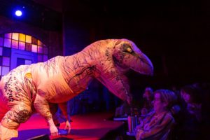• A woman who wants a man to look at her face, not her body, dons a dinosaur suit to make her point.