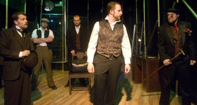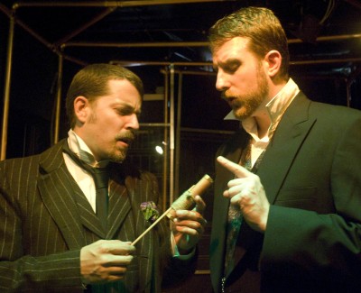 The beauty of our storefront theaters is that we get to see some great theater at very low cost. Idle Muse Theatre Company, a relative newcomer to the Chicago theater scene is presenting a wonderful little story, “Sherlock Holmes: The Final Adventure” in a marvelous little spot in Rogers Park ( and area just bustling with theater activity) at the Side Project Theatre located at 1439 West Jarvis. This adaptation by Steven Dietz of the work by William Gillette and Arthur Conan Doyle, is a marvelous look at the last case handled by the great Sherlock Holmes ( or is it?). Director Evan Jackson utilizes the very small stage area of this “black box” theatre very well on an unusual set by Dennis Mae. Try to visualize an are that is probably 18′ wide by about 19′ deep and that is the area we are talking about. In this space we have a London Street, Holme’s house, a church, A factory, a train and even Reichanbach Falls in Switzerland. All of this is accomplished by using glass on hangers ( almost like shower doors) that hang from pipes. This allows for quick scene changes and despite its being plain and simple, it works!