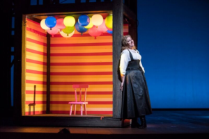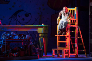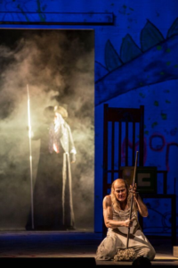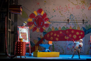 Mime has been reduced to a lone work station in his own house. At rise, the dwarven blacksmith is battering away on another toy sword Siegfried will inevitably break, cursing his inability to reforge the one sword the boy could use to slay the dragon Fafner (Patrick Guetti), allowing Mime to claim his horde of treasures. Set designers Johan Engels and Robert Innes Hopkins have made this very much Siegfried’s room: his drawings and plushy likenesses of Fafner abound, as do his tributes to his deceased mother and father. A teenager who acts like a six-year-old, Siegfried is quite the tyrant. Fritz plays him with a loping, child’s gait as he chases Mime into a playpen, waving a finger and berating him. Klink’s Mime loves channeling his resentment into martyrdom; he mournfully wails about all he has sacrificed for a child who hates him, but he responds to reasonable questions with tirades of verbal abuse. And although Mime whines that he is old and feeble, the blacksmith’s movements are strong and fluid, albeit off-putting. The same is true of his voice, which is clear and melodious, in contrast to his grotesque appearance. Indeed, Klink, a heldentenor in his own right, deserves commendation for making the comic relief villain such charismatic presence. Siegfried’s toxic relationship with the man who raised him to be a disposable weapon is rich grounds for exploration and remains taut right up until the end.