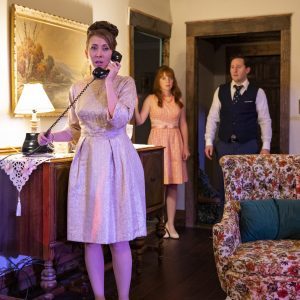 Before the show starts, the audience members (i.e., the guests) receive an invitation for a celebration of Mrs. Suzanne Wellington (Anne Sheridan Smith), hosted by Ellie Coutier (Sarah Grant) and her husband Beau (Max Stewart). It’s supposed to be a house party for Suzanne’s 40th birthday, but the guest of honor is very upset about it: She doesn’t want to think of herself as being past 39 years old—and we see her take the banner down, while her husband Jackson (Joe Metcalfe) humors her. At the same time, Suzanne’s best friend Lauren Lyon (Curley Cornelius) takes the opportunity to insult her publicly (because she knows her so well). Charles, Lauren’s husband (Mat Bowdren) is seeking to become Georgia’s next U.S. senator, following in his father-in-law’s footsteps. Their associate Tucker Alsworth (Miles Borchard) brings Cassie Smith (Reese Parish), a black woman, to the house party—at a time when breaching the color line was not acceptable in polite white society. Cassie is currently an assistant to the local gossip columnist and aspires to become something greater in the field of journalism There is a well-noted expression, “Oh what a tangled web we weave.” This could easily apply to Ellie, who, as it turns out, has a history with several men. Combine this with everyone drinking too much and being a bit too frank, then you have the makings of an interesting fiasco. As for the details about the numerous and sundry characters and controversies, you’ll have to see the show for yourself.