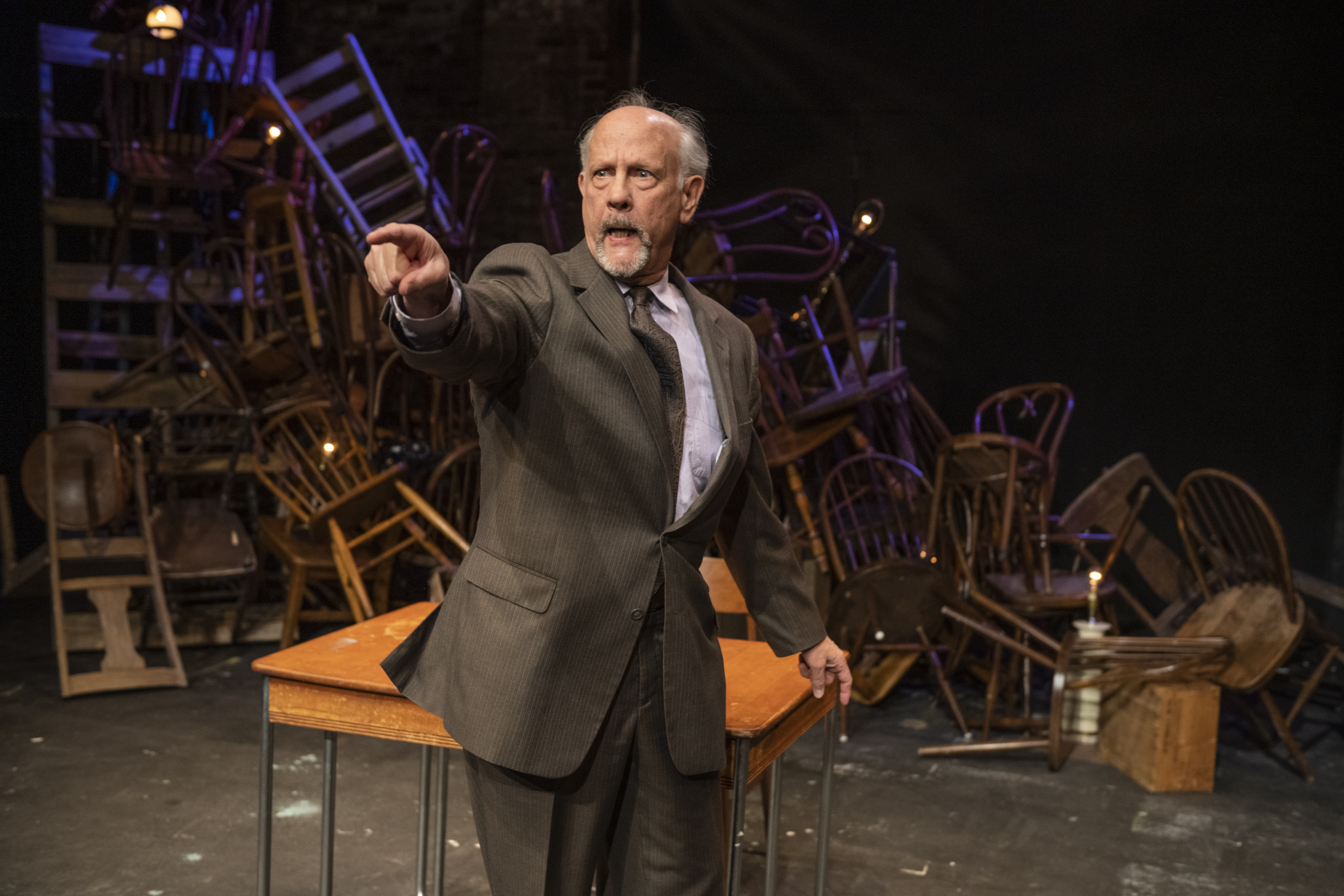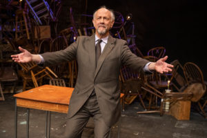 [rating=5]How many days has it been since you enjoyed your life? Since this Covid pandemic hit us and things became closed and often tabu, many people have not left their homes at all. Television ( thank the lord for Netflix) has been their salvation. Grocery shopping, or running to the drug store, a release of energy. In the press release about the Chicago Premiere being presented by American Blues Theater, they tell us to think, “you’ve tried everything. Yoga ,Acupuncture, Therapy. You juiced! You journaled! You ate special foods!”, and many more. Life was different! Life was strange! Every day was “blursday”. For me, I was grateful for Sundays- I bowl in the morning ( with a mask for almost two years) and then do the radio show on WCPT- Sunday is a real day and has been for me during this period.But many people have been listless, doing very little and just waiting for the day when life can return to normal. We are still not there, but slow and sure, we are headed in the right direction. In the Chicago premiere of “Stand Up If You’re Here Tonight”, a masterpiece written and directed by John Kolvenbach, we get to look into the mind of our “leader”called simply “Man” ( an incredible performance by Jim Ortlieb).