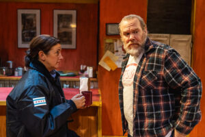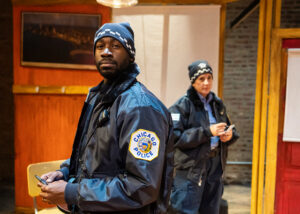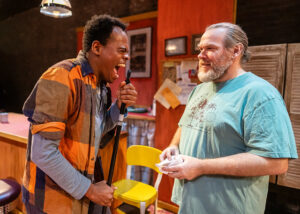 It has been awhile since I have seen a production of this masterpiece, and I guess there were some parts that had slipped my mind, but under the slick direction of John Mossman, with the aid of fight director David Blixt , on a set designed by Kevin Hagan, I found myself drawn back into the story that I last saw in 2008. Wow! Seventeen years later, it still is a story that could have happened yesterday ( or perhaps could happen in the years to come). When the play opens, the donut shop is a mess. Vandels have broken in and thrown everything around, painting the wall. Art is talking with his next door neighbor, Max ( Reid Coker), a Russian who wants to buy the donut store so he can expand his shop. We also meet the “beat” cops, James Bailey ( Kevin Aoussou) and Randy Osteen ( deftly handled by Kristin Collins) who has a “thing” for Arthur.