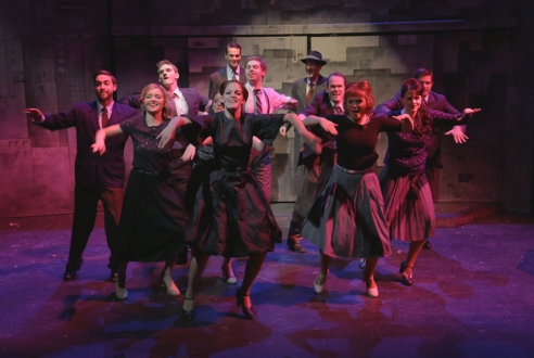 What we have during this show is how Sidney gets to JJ, how JJ uses Sidney, How Susan and Dallas depend on others and yet feel safe and secure. We also have Sidney’s girlfriend, Rita  ( sterlingly played by  Christina Hall), who is also sacrificed along the way. We have a larger than life ensemble that turly create the tension through song and dance-Madeline Acquaviva,Christine Boulette, Shaun Baer, Mike Danovich, Zach Drane, Kim Green, Jordan Gryzbowski, Rus Rainear, Brennan Roach, Julie Schroll, Stephanie Souza and Stephanie Wohar. Five live musicians under the direction of Aaron Benham on a set created and designed  by Zachary Gipson. While the challenge of this young theater company was a huge one, I must say that they handled it well. With each production, Director Glover shows his solid understanding of the script they have selected as well as selection of his actors. Choreographer Steven Spanopoulos uses the intimate stage area to its fullest advantage.