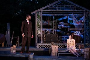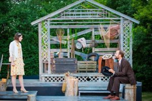 The chemistry between these two characters is powerful. They are “lost souls” that one would never feel could be a match, but thru the cleverly written store, we see surprise after surprise and in all honesty, the actors are the reason. The play is smoothly directed by Tad Ingram. The set (Lauren M. Nichols)is unique in design and the entire “under the stars ” thing, effective. The tech crew, working outdoors gets the job done efficiently. Hats off to Will Hughes, Trey Brazeal ( lights)and Kaitlyn Salemi (Stage Manager) as well as prop designer, who also handled the costumes ( Ellen Markus). In the last few years, we have noticed a new technical category, Intimacy coordinator ( or sometimes called choreographer). In this production Claire Yearman handles the intimacy and it says fight, but I was not aware of any true fight to mention. The intimacy worked!